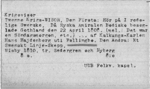 //// Kriffsvi aor //// Tv/enne Krirs-WISOR, Der Företa; Kör på I rede-11 ge- Swenske, Då Ryaka Amiralen Bodisko beseglade Gothland der 22 April lBOf, (mel.: D«t war en Söndansmor^on» etc.) . . af Kalkungs-Karlen Hans Hajdenberjn; uti Follingbe, Den Andra; Et Swenskt Linje-Skepp, -»»»m^^ Wishy 1810, tr» Sftdergren ech Nyberg 8 s. 8; o //// UtJB Folkv. kape 1 * ////