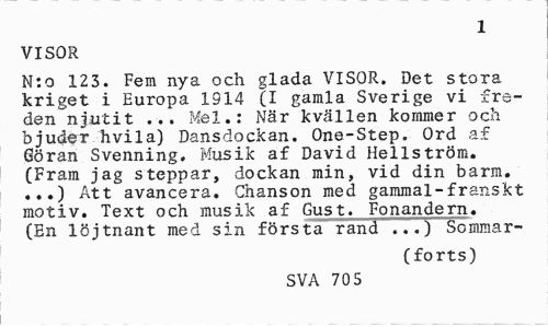 //// 1 //// VISOR //// N:o 123. Fem nya och glada VISOR. Det stora kriget i Europa 1914 (I gamla Sverige vi freden njutit ... Mel.: När kvällen kommer och bjuder hvila) Dansdockan. One-Step. Ord af Göran Svenning. Musik af David Hellström. (Fram jag steppar, dockan min, vid din barm. ...) Att avancera. Chanson med gammal-franskt motiv. Text och musik af Gust. Fonandern. (En löjtnant med sin första rand ...) Sommar- //// (forts) //// SVA 70 5 ////