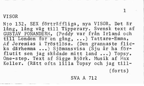 //// 1 //// VISOR //// N:o 132, SEX förträffliga, nya VISOR. Det är lång, lång väg till Tipperary. Svensk text af GUSTAV FONANDERN» (Peddy var från Irland och till London for en gång, ...) Tattare-Emma* Af Jeremias i Tröstlösa. (Den grannaste flicka därhemma ...) Sjömansvisa (Sju år ha förflutit sen jag skådade mitt land ...) Topsy. One-step. Text af Sigge Björk. Musik af Max Keller. (Rätt ofta lilla Topsy och jag till- //// (forts) //// SVA A 79 2 ////