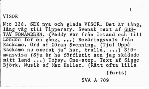 //// 1 //// VISOR //// N:o 128. SEX nya och glada VISOR. Det är lång, lång väg till Tinperary. Svensk text af GUS-TAV FONANDERN. (Peddy var från Irland och till London for en gång, ...) Beväringsvals från Backamo, Ord af Göran Svenning. (Tjo! Uppå Backamo nu exerat ja" har, tralla, ...) Sjömansvisa (Sju år ha förflutit sen jag skådade mitt land ...) Topsy. One-step. Text af Sigge Björk. Musik af Mfcx Keller. (Rätt ofta lilla //// (forts) //// SVA A 709 ////