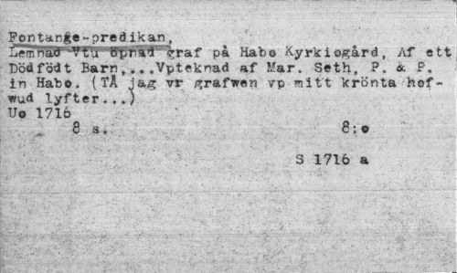 //// Po ritande ~ pre d ikan, //// ¦ Semnär^TO'• %raf på Habo Kyrkiogård, Af ett //// Död föd t Barn,...Vpteknad af Mar. Seth, P. & P. in Habo. (TÅ vr /*rafwen vp mitt krönta hof- //// wud lyfter.,.) Uo 1716 //// 83. 8; o //// S 1716 a ////