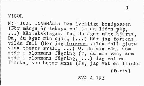//// 1 //// VISOR //// N:t 103. INNEHALL: Den lycklige bondgossen (För många år tebaga va' ja en liden påg, ...) Kärleksklagan: Du, du äger mitt hjärta, Du, du äger min själ, (...) Hör jag forsens vilda fall (Hör jag forsens vilda fall gjuta sina toners svall,'...) O. du min vän, som står i blommans fägring (O, du min vän., som står i blommans fägring, ...) Jag vet en flicka, som heter Anna (Ja, jag vet en flicka //// (forts) //// SVA A 79 2 ////
