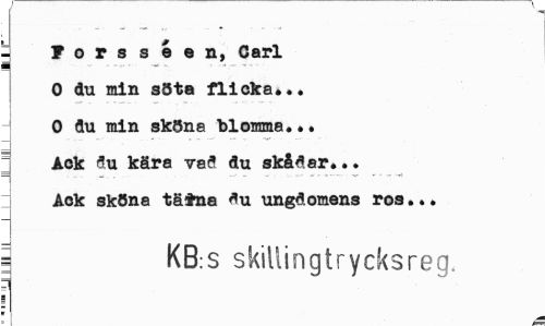 //// - Forsséen, Carl //// 0 du min s5ta flicka».. J 0 flu min sköna blomma... //// Ack <5u kära va<5 au skådar... //// Ack sköna täfrna ungdomens ros.*. //// I KB:S skillingtrycksreg. ////