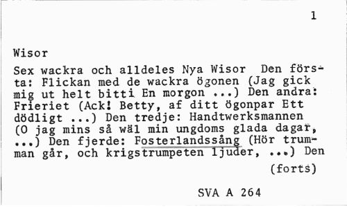 //// 1 //// Wisor //// Sex wackra och alldeles Nya Wisor Den första: Flickan med de wackra ögonen (Jag gick mig ut helt bitti En morgon ,..) Den andra: Frieriet (Acki Betty, af ditt ögonpar Ett dödligt ...) Den tredje: Handtwerksmannen (0 jag mins så wäl min ungdoms glada dagar, ...) Den fjerde: Fosterlandssång (Hör trumman går, och krigstrumpeten ljuder, ..•) Den //// (forts) //// SVA A 264 ////
