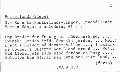 //// 2 //// Fos te rlandsfSånger //// Nya Swenska Fosterlands=Sånger, Innehållande Femton Sånger i anledning af ... //// Upp Bröder för Konung och fädernesbygd, . Swenska Bonden ärfde Swenska jorden, ... Mel.: Djupt i hafwet på demantehällen I Dalar- //// ne bodde, i Dalarne bor Bland armod ... Mel.: Wid Clebergets sida stod fordom en borg Soldaten han älskar sin Kung och sitt land, .. //// (forts) //// SVA A 38 2 ////