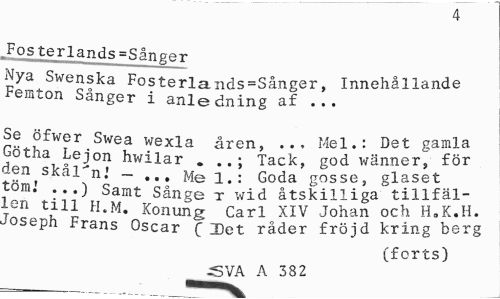 //// 4 //// .Fos ter lands =Sånger //// Nya Swenska Fosterla.nds=Sånger, Innehållande Femton Sånger i anledning af ... //// Se öfwer Swea wexla åren, ... Mel.: Det gamla Götha Lejon hwilar . ..; Tack, god wänner, för den skålan.' ~ ... Mel.: Goda gosse, glaset töm.» ...) Samt Sånge t wid åtskilliga tillfällen till II.M. Konung Carl XIV Johan och H.K.H. Joseph Frans Oscar [Jet råder fröjd kring berg //// (forts) //// .SVA A 382 ////