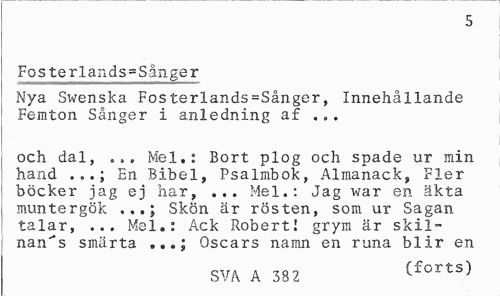 //// 5 //// Fosterlands=Sånger //// Nya Swenska Fosterlands=Sånger, Innehållande Femton Sånger i anledning af ... //// och dal, ... Mel,: Bort plog och spade ur min hand En Bibel, Psalmbok, Almanack, Fler //// böcker jag ej har, ... Mel.: J ag war en äkta muntergök Skön är rösten, som ur Sagan //// talar, ... Mel.: Ack Robert! grym är skil-nan's smärta Oscars namn en runa blir en //// SVA A 382 (forts) ////