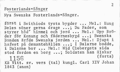 //// 2 //// Fosterlands=Sånger //// Nya Swenska Fosterlands=Sånger. //// först i Swithiods tysta bygder ... Mel.: Kung Beles söner gerna dragé Du Fader, som //// styrer båd" himmel och jord ... Mel.: Upp Bröder för Konung och fädernesbygd ...; Swenska Bonden ärfde Swenska jorden ... Mel.: Djupt i hafwet på demantehällen ...; I Dalarne bodde, i Dalarne bor ... Mel.: Wid Clebergets sida stod fordom en borg Soldaten han älskar //// | j 5 g " (forts) //// KB Vitt. sv. vers (tal) kungl. Carl XIV Johan 1843 (anon) ////