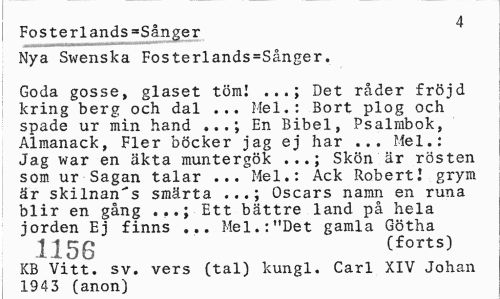 //// Fosterlands=Sånger 386 //// Nya St^enska Fosterlands=Sånger. //// Goda gosse, glaset töm! ...; Det råder fröjd kring berg och dal ... Mel.: Bort plog och spade ur min hand ...; En Bibel, Psalmbok, Almanack, Fler böcker jag ej har ... Mel.: Jag war en äkta muntergök ...; Skön är rösten som ur Sagan talar ... Mel.: Ack Robert! grym är skilnan"s smärta ...; Oscars namn en runa blir en gång .,.; Ett bättre land på hela jorden Ej finns ... Mel.:"Det gamla Götha //// 1156 cforts) //// KB Vitt. sv. vers (tal) kungl. Carl XIV Johan 1943 (anon) ////