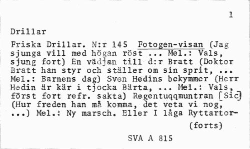 //// 1 //// Drillar //// Friska Drillar. N:r 145 Fotogen-visan (Jag sjunga vill med högan röst ... Mel.: Vals, sjung fort) En vädjan till d:r Bratt (Doktor Bratt han styr och ställer om sin sprit, ... Mel.: Barnens dag) Sven Hedins bekymmer (Herr Hedin är kär i tjocka Bärta, ... Mel.: Vals?_ först fort refr. sakta) Regentuqqmuntran [SicJ (Hur freden han må komma, det veta vi nog^ ...) Mel.: Ny marsch. Eller I låga Ryttartor- //// (forts) //// SVA A 815 ////