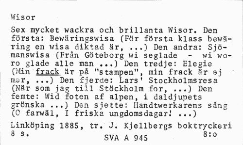 //// Wisor //// Sex mycket wackra och brillanta Wisor. Den första: Bewäringswisa (För första klass bewä-ring en wisa diktad är, ..,) Den andra: Sjö-manswisa (Från Göteborg ttfi seglade - wi voro glade alle man ...) Den tredje: Elegie (Min frack är på "stampen", min frack är ej mer, ...) Den fjerde: Lars' Stockholmsresa (När som jag till Stockholm for, ...) Den femte: Wid foten af alpen, i daldjupets grönska ..,) Den sjette: Handtwerkarens sång (0 farwäl, I friska ungdomsdagar.' ...) //// Linköping 1885, tr. J. Kjellbergs boktryckeri //// 8 St SVA A 945 8:0 ////