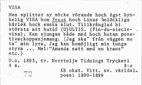 //// VISA //// Hen splitter ny möcke rörande hoch ögst hyn-kelig VISA hom Frans hoch Linas holöckliga kärlek hock emska slut. Tillkrånglad hi största ast hutåf (U)ULTIS. (Fin-du-siecle- -visa). Kan sjungas både med hoch hutan pose-tivackoppanjemang. (Jag ska" från väggen nu ta" min lyra, Jag kan homöjligt min tunga styra ... Mel:"Amanda satt med en krans" etc.) //// U.o. 1893, tr. Norrtelje Tidnings Tryckeri 4 s. 8:0 //// KB okat. Vitt. sv. världsl. - poesi 1890-1899 ////