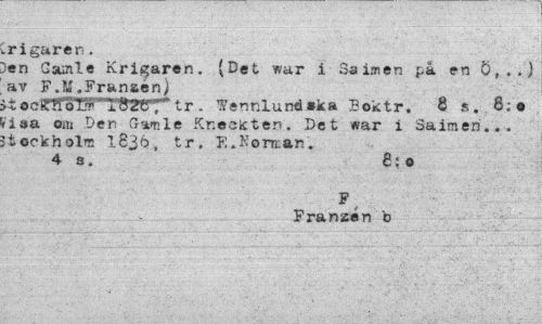 //// rigaren. //// Jen Gamle Krigaren. (Det war i Saimen på en ö,.. .} av F.M.Fransen) //// ?t octtHoT^^TÖ^CT* tr . Wennlund »ka Boktr. 6 s. 8; • risa om Den Gamle Kneckten. Det «ar i Saimen... Stockholm 1836, tr. K.Koman. //// 4a. 8:0 //// F //// Franzén b ////