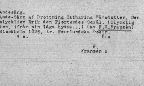 //// kndesång, //// knde-3ång af Drottning Catharina Må^sdotter, Den »Lycklige Rrik den Fjortondes Gemål. {Olycklig len, ifrån sin låga hydda,..)(av F.M.Franzén) Stockholm 1325, tr. Wennlund eka b^f^^^ 4 3, 8:« //// F> //// Franaan a ////