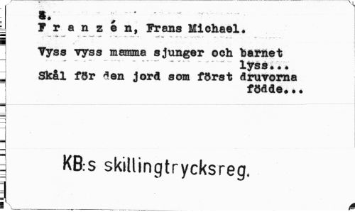 //// Franzén, Frans Miohael. //// i //// Vyss vyss mamma sjunger och barnet //// lyss».. //// Skål för den jord som först druvorna //// födde*•• //// ¦ //// i //// g KB:S skiUingtrycksreg. //// ¦v / ////