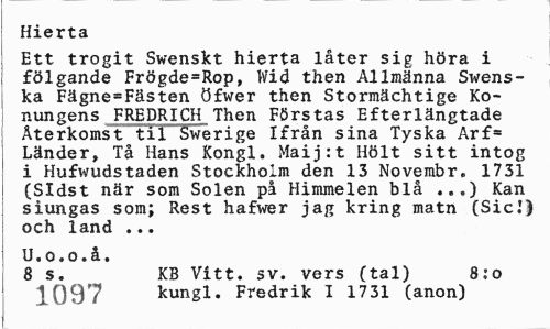 //// Hierta //// Ett trogit Swenskt hierta låter sig höra i fölgande Frögde=Rop, Wid then Allmänna Swenska Fägne=Fästen öfwer then Stormächtige Konungens FREDRICH Then Förstas Efterlängtade Återkomst til Swerige Ifrån sina Tyska Arf-Länder, Tå Hans Kongl. Maij:t Hölt sitt intog i Hufwudstaden Stockholm den 13 Novembr, 1731 (SIdst när som Solen på Himmelen blå .,.) Kan siungas som; Rest hafwer jag kring matn (Sicl) och land ... //// U.o.o.å. //// 8 s. KB Vitt. sv. vers (tal) 8,°o //// 1097 kungl. Fredrik I 1731 (anon) ////