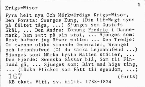 //// 1 //// Krigs=Wisor //// Fyra helt nya Och Märkwärdiga Krigs=Wisor, Den Första: Swerges Kung, (Din Lif=Wagt syns på fältet tåga, ...) Sjunges som Gustafs Skål, ... Den Andra: Konung Fredric i Danne-mark, han satt på sin stol, ... Sjunges som: Rest hafwer jag öfwer watten ... Den Tredje: Om twenne olika sinnade Generaler, Wrangel och Lejonhufwud (01 du käcka Lejonhufwud ...) Sjunges som: Mörka tysta Natten ställer, ... Den Fjerde: Swenska Gåssar blå, Som til Finland gå, ... Sjunges som: Bårt med höga ting, ... (Täcka Flickor som Fått til egendom, //// 1G7 (forts) //// KB okat. Vitt. sv. milit. 1788-1834 ////