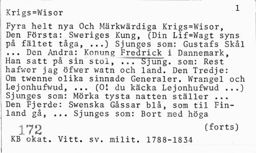 //// Krigs=Wisor ^ //// Fyra helt nya Och Märkwärdiga Krigs=Wisor, Den Första: Sweriges Kung, (Din Lif=Wagt syns på fältet tåga, ...) Sjunges som: Gustafs Skål ... Den Andra: Konung Fredrick i Dannemark, Han satt på sin stol, ..."Sjung, som: Rest hafwer jag öfwer watn och land. Den Tredje: Om twenne olika sinnade Generaler. Wrangel och Lejonhufwud, ... (01 du käcka Lejonhufwud ...) Sjunges som: Mörka tysta natten ställer ... Den Fjerde: Swenska Gåssar blå, som til Finland gå, ... Sjunges som: Bort med höga //// (forts) //// KB okat. Vitt. sv. milit. 1788-1834 ////