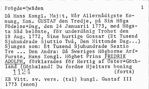 //// Frögde=Qwäden 1 //// Då Hans Xongl. Maj:t, Wår Allernådigste Konung, Kon. GUSTAF den Tredje, på Sin Höga Födelse=Dag, den 24 Januarii 1773, med Högsta Nåd belönte, för underdånig Trohet den 19 Aug. 1772, Sine hurtige Gossar (Et Tusend Sjuhundrade Sjuttio Två, Den Nittonde Dag...} Sjunges som: Et Tusend Sjuhundrade Sextio Tre ... Den Andra: Då Sweriges Högborne Arf= Furste, Hans Xongl. Höghet Prins FREDRIK ADOLPH, förklarades för Hertig af öster=Göth-iänå (Göthaland.' Du fordne Hjeltars boning //// 1124 (forts) //// KB Vitt. sv. vers. (tal) kungl. Gustaf III //// 1773 (anon) ////
