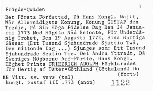 //// Frögde=Qwäden ^ //// Det Första Författad, Då Hans Kongl. Maj:t, Wår Allernådigste Konung, Konung GUSTAF den Tredje, På Sin Höga Födelse Dag Den 24 Janua-rii 1773 Med Högsta Nåd Belönte, För Underdånig Trohet, Den 19 Augusti 1772, Sina Hurtiga Gåssar (Ett Tusend Sjuhundrade Sjuttio Twå, Den nittonde Dag ...) Sjunges som: Ett Tusend Sjuhundrade Sextio Tre. Det Andra Yttradt, Då Sweriges Högborne Arf=Förste, Hans Kongl. Höghet Prints FRIEDRICH ADOLPH Förklarades för Hertig af 5ster=Göthland (GöthalandI Du //// KB Vitt. sv. vers (tal) (forts) //// kungl. Gustaf III 1773 (anon) 1122 ////