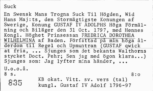 //// Suck //// En Swensk Mans Trogna Suck Til Högden, Wid Hans Maj:ts, den Stormägtigste Konungen af Swerige, Konung GUSTAF IV ADOLPHS Höga Förmäl-ning och Biläger den 31 Oct. 1797, med Hennes Kongl. Höghet Prinsessan FREDRICA DOROTHEA WILHELMINA af Baden. Författad pä min höga ålderdom til Regel och Upmuntran (GUSTAF qwick at fria,... Sjunges som det bekanta Walthorns stycket Doct. Pehr; Sen jag med ögon klara...) Sjunges som: Jag lyfter mina händer, ... //// U.o.o.å. //// 8 s. 8 :o //// Q^c- KB okat. Vitt. sv. vers (tal) kungl. Gustaf IV Adolf 1796-97 ////