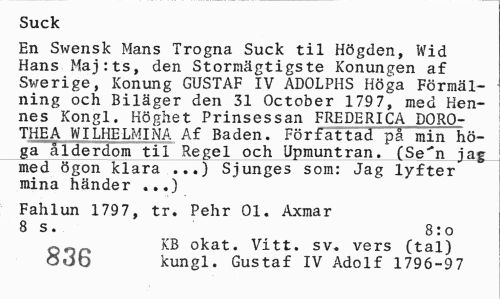 //// Suck //// En Swensk Mans Trogna Suck til Högden, Wid Hans Maj:ts, den Stormägtigste Konungen a£ Swerige, Konung GUSTAF IV ADOLPHS Höga Förmäl-ning och Biläger den 31 October 1797, med Hennes Kongl. Höghet Prinsessan FREDERI CA_DOROr THEA WILHELMINA Af Baden. Författad pä min hö-ga ålderdom til Regel och Upmuntran. (Se"n jag med ögon klara ...) Sjunges som: Jag lyfter mina händer ...) //// Fahlun 1797, tr. Pehr 01. Axmar 8 s. 8:o //// Q# KB okat. Vitt. sv. vers (tal) //// oob kungl. Gustaf IV Adolf 1796-97 ////