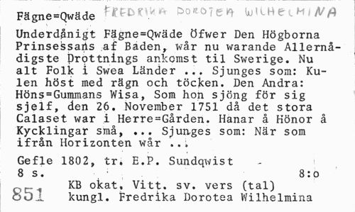 //// Fägne=Qwäde W&nkft WlKCi M i fi/& //// Underdånigt Fägne=Qwäde öfwer Den Högborna Prinsessans af Baden, wår nu warande Allernå-digste Drottnings ankomst til Swerige. Nu alt Folk i Swea Länder ... Sjunges som: Kulen höst med rägn och töcjcen. Den Andra: Höns=Gummans Wisa, Som hon sjöng för sig sjelf, den 26. November 1751 då det stora Calaset. war i Herre-Gården. Hanar å Hönor å Kycklingar små, ... Sjunges som: När som ifrån Horizonten wår ..i //// Gefle 1802, tr. E.P. Sundqwist 8 s. 8:o //// KB okat. Vitt. sv. vers (tal) oul kungl. Fredrika Dorotea Wilhelmina ////