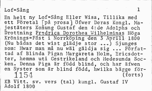 //// Lof=Sång 1 //// En helt ny Lof=Sång Eller Wisa, Tillika med ett Företal [på prosa) öfwer Deras Kongl. Majestäters Konung Gustaf den 4:de Adolphs och Drottning Fredrica Dorothea Wilhelminas Höga KrÖnings=Fäst i Norrköping den 3 Aprill 1800 (Nu bådas det wist glädje stor ._-.) Sjunges som: Hwar man må nu wäl gäldja sig ... Författad af Blinda Pigan Margareta Holm, Ericsdotter, hemma uti Gestrikeland och Hedesunda Socken. Denna Piga är född blind, och har äfwen en Syster som är blind född, hwilka bägge för- //// 1154 //// KB Vitt. sv. vers (tal) kungl. Gustaf IV //// Adolf 1800 ////