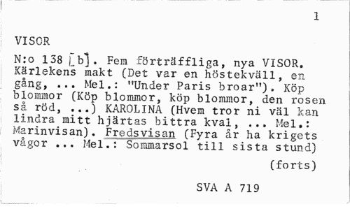 //// 1 //// VISOR //// N:o 138 [b]. Fem förträffliga, nya VISOR. Kärlekens makt (Det var en höstekväll, en gång, ... Mel.: "Under Paris broar"). Köp blommor (Köp blommor, köp blommor, den rosen så röd, ...) KAROLINA (Hvem tror ni väl kan lindra mitt hjärtas bittra kval, ... Mel.: Marinvisan). Fredsvisan (Fyra år ha krigets vågor ... Mel.: Sommarsol till sista stund) //// (forts) //// SVA A 719 //// I ////