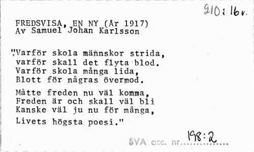 //// mi \\ov. //// FREDSVISA, EN NY (År 1917) Av Samuel Johan Karlsson //// '.'Varför skola männskor strida, varför skall det flyta blod. Varför skola många lida, Blott för någras övermod. //// Måtte freden nu väl komma, Freden är och skall väl bli Kanske väl iu nu för många, //// Livets högsta poesi." //// c yA r- n- ^ //// & /J\ C-:». ...T... ////
