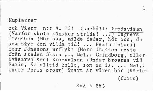 //// 1 //// Kupletter //// och Visor n:r A. 151 innehåll: Fredsvisan (Varfcr skola mänskor strida? . .«j iegners fredshön (Hör oss, milde fader, hör oss, du som styr den vilda tid! ... Psalm melodi) Herr Jönssons utflykt (Herr Jönsson reste från staden Skara ... Mel.: Grindborg, eller Kväsarvalsen) Bro-valsen (Under broarne vid Paris, Är alltid kallt, som en is. ... Mel.: Under Paris oroar) Snart är våren här (Kärle- //// (forts) //// SVA A 86 5 ////