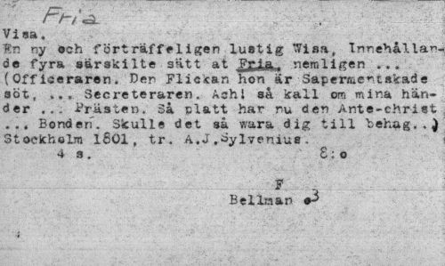 //// ' - r7-/<a_ //// Visa. //// Kn ny sch förträffeligen lustig Wisa, Innehållande fyra särskilts sätt a. t F^la f neroligen ... (Officeraren. D«n Flickan hon är Sapermentskade söt, ... Secreteraren. Åchl så kall om mina händer ... Prästen, 3å platt har nu den Ante-chriet ..« Bonden. SJculle det så wara dig till "behag.,} Stockholm 1601, tr. A. J . £>y 1 v e niu s, //// 4 s . £: o //// Bellaan •-> ////