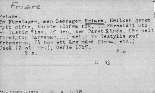 //// ^riiire . //// tr Försiaren, men Bedragen Friare, Hwilken gerem -y tt elfte, tfcnfcte blifwa rfk," T'.". FÖrestält uti •r. lust ig Ti sa, Af den , s» Paret KJir.de. (In helt rörai*:ti£ Da rn em ar.,... mel.: En Teatylis p;af 'röfderop, Tå hor. ett ac* näri finna, etc.) :ooå (2 ol. tr.), Gefle 1765. 8 s. //// L 43 ////