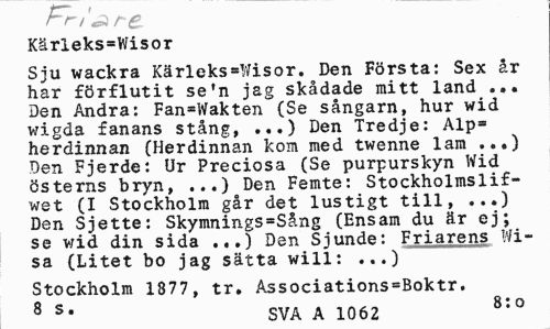 //// rr, «are //// Kärieks=Wisor //// Sju wackra Kärleks»Wisor. Den Första: Sex år har förflutit se'n jag skådade mitt land ... Den Andra: Fan=Wakten (Se sångarn, hur wid wigda fanans stång, ...) Den Tredje: Alp= herdinnan (Herdinnan kom med twenne lam ...) Den Fjerde: Ur Preciösa (Se purpurskyn Wid österns bryn, ...) Den Femte: Stockholmslif-wet (I Stockholm går det lustigt till, ...) Den Sjette: Skymnings=Sång (Ensam du är ej; se wid din sida ...) Den Sjunde: Friarens Wisa (Litet bo jag sätta will: ...) //// Stockholm 1877, tr. Associations=Boktr. //// 8 s' SVA A 1062 8:0 ////