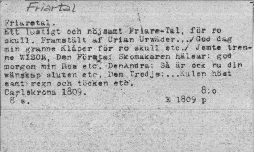 //// ?ri&r©tal. //// Ett lustigt och nöjaaaat Friare* Tal, för ro ätcull. Fram*tält af Urian Ur-s&der.,./God dag min granne Klåper for ro skull etc./ Jemts tren-pe WISOR, Den Fcr*t«: Skomakaren hälsar; god morgon min Bos etc. DenAndra; 3å är ock ru din wänskap sluten etc. Psn Iredje:.Kulen höst samt' regn och töcksn etc'. Carlskrona 1009. 8:0 //// 8 s, s 1809 p ////
