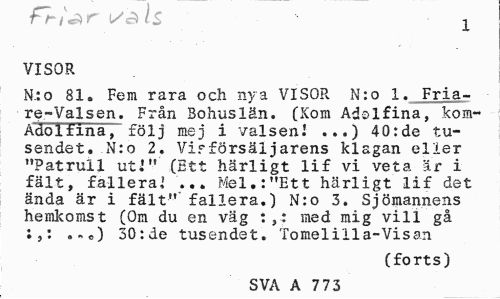 //// fri Ar 1$ x //// VISOR //// Nio 81» Fem rara och nya VISOR N:o 1. Friare -Valsen. Från Bohuslän. (Kom Adolfina, kom-Adolfina, följ mej i valsen! ...) 40:de tu-sendet. N:o 2. Virförsäljarens klagan eller "Patrull uti" (Ett härligt lif vi veta är i fält, fallera,' ... Mel.: "Ett härligt lif det ända är i fält" fallera.) N:o 3. Sjömannens hemkomst (Om du en väg :,: med mig vill gå :,: . 30:de tusendet. Tomelilla-Visan //// (forts) //// SVA A 773 ////