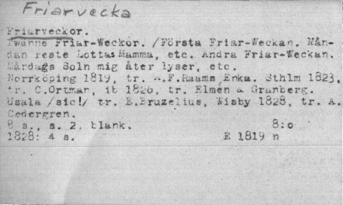 //// r /-/ «snr <s c //// Ytj ^rveca.or. //// lVa.n?ie •rViar-Weckor. /Första Friar-#eekan, Kån-r ur. reste Lottas Masima, etc. Ändra Friar-Weekan. . u.rd«±gs 3oln mig åter I^ser, etc. Ncrrkcping 18lV, tr. fiaaas £rtka. cthlm 1823, + r. C .örunar, ib 28k:o, tr. Elmén <*. Granberg, tfsala /sic!/ tr. i. ..Bruzel lus, irisby 1328, tr. A. .'.'eoergren. //// " a., s. 2. tlark. B: o //// 1828: 4 a. £ l8l:> n ////