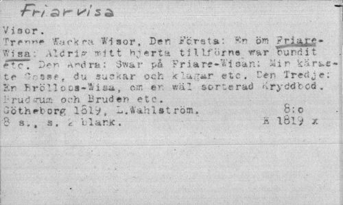 //// V i sor. //// '.r.Mckr.t Wisor, Den .Första: K-n öm Fri^jfe» Wisa : Al C ri & t-1 tt Hierta tillförne var rund i t etc. Der. A^drfe; Swar på Friare»*.'! san; 24 i r» kärs.e-tr O-sse, du suckar och klagar etc. Cen Tredje; £r bröllocs-^iaa, om er. wäl sorterad K.ryddbcd . l:rud mm och Bruden etc. //// G-öthebore. loiy, L.vVahlst röm. 8:0 //// 8 a., s, c blark . E l6l> x ////