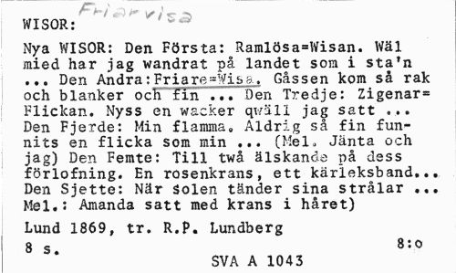 //// r* >"•/ Slt* y i r- //// WISOR: //// Nya WISOR: Den Första: Ramlösa=Wisan. Wäl mied har jag wandrat på landet som i sta'n ... Den Andra:Fria re ~Wis a. Gåssen kom så rak och blänker och fin ... Den Tredje: Zigenar= Flickan. Nyss en wacker qv/äll jag satt ... Den Fjerde: Min flamma. Aldrig så fin funnits en flicka som min ... (Mel. Jänta och jag) Den Femte: Till twå älskande på dess förlofning. En rosenkrans, ett kärleksband... Den Sjette: När solen tänder sina strålar ... Mel.: Amanda satt med krans i håret) //// Lund 1869, tr. R.P. Lundberg 8 s. 8:0 //// SVA A 104 3 ////