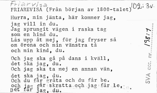 //// rbi, 11\6 ¦ 3^ //// FRIAREVISA (Från början av 1800-talet) //// Hurra, min jänta, här kommer jag, //// jag vill in du. ; //// Jag sprungit vägen i raska tag //// som en hind du. : //// Lås upp åt mej, för jag fryser så //// om örona och min vänstra tå //// och min kind, du. //// Och jag ska gå på dans i kväll, //// det ska jag, du. <j //// Och jag ska ta mej en annan vän, //// det ska iag, du. ^ //// Och du far ?rråta och du får be. r^ //// och ia" får skratta och jag får le, //// net far' Tacr. du. " ////