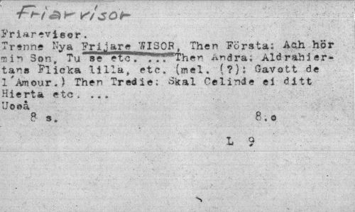 //// Kriar»vieor. //// Trenne Nya Friiare 'JflSOR. Then Första; Ach. hör ti in Son/ Tu se r'£e r...;TT*Then Andra; Aid rahi artans Flicka lilla, etc. (mel. (?): Gavott de 1 'Amour.) Then Tredie; Skal Celinde ei ditt Hierta etc ... 'Jo //// 8 s. 8.0 //// L 9 //// ¦s ////