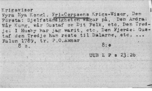 //// Kri gavisor //// Fyra Nya Kongl... Frl-Cprpaeris Krigs-Wisor. Den Första: Sj elfstäfléigketeWfSfear på, Den Ardra; Wår Kung, vtår Gustaf se Dit Folk, etc. Den Tredje; I Husby har jag varit, etc. Den Fjerde: Gustaf den Tredje han reste til Dalarne, etc. ... Falun 1789, tr. P.O.Axraar //// 8 s. 8;o //// UUB 1 P s 23;2b ////