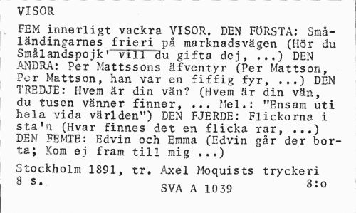 //// VISOR //// FEM innerligt vackra VISOR. DEN FÖRSTA: Små-länclingarnes frieri på marknadsvägen (Hör du Smålandspo jkvill du gifta dej, ...) DEN ANDRA: Per Mattssons äfventyr (Per Mattson, Per Mattson, han var en fiffig fyr, ...) DEN TREDJE: Hvem är din vän? (Hvem är din vän, du tusen vänner finner, ... Mel.: "Ensam uti hela vida världen") DEN FJERDE: Flickorna i sta'n (Hvar finnes det en flicka rar, ...) DEN FEMTE: Edvin och Emma (Edvin går der borta; Kom ei fram till mig ...) //// Stockholm 1891, tr. Axel Moquists tryckeri //// 3 S* SVA A 10 39 8:0 ////