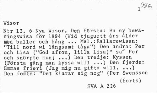 //// Wisor //// N:r 13. 6 Nya Wisor, Den första: En ny bewä-fingswisa för 1894 (Wid tjuguett års ålder med buller och bång ... Mel.:Rallarewisan: "Till nord xvi långsamt tåga") Den andra: Per och Lisa ("God afton, lilla Lisa;" sa" Per och snörpte mun; ...) Den tredje: Kyssen (Första gång man kyssa v/ill Den fjerde: //// Emmas frieri (Jag mig nu gifta will. ...) Den femte: "Det klarar sig nog" (Per Swensson //// (forts) //// SVA A 2 26 ////