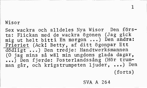 //// 1 //// Wisor //// Sex wackra och alldeles Nya Wisor Den första: Flickan med de wackra ögonen (Jag gick mig ut helt bitti En morgon »..) Den andra: Frieriet (Acki Betty, af ditt ögonpar Ett dödligt ...) Den tredje: Handtwerksmannen (0 jag mins så wäl min ungdoms glada dagar, ..„) Den fjerde: Fosterlandssång (Hör trumman går, och krigs trumpeten ljuder, .„<,) Den //// (forts) //// SVA A 26 4 ////