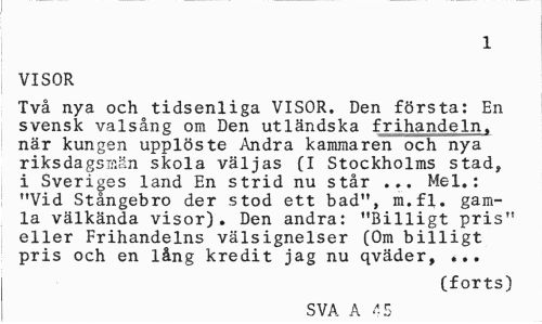 //// 1 //// VISOR //// Två nya och tidsenliga VISOR. Den första: En svensk valsång om Den utländska frihandeln. när kungen upplöste Andra kammaren och nya riksdagsmän skola väljas (I Stockholms stad» i Sveriges land En strid nu står ... Mel.: "Vid Stångebro der stod ett bad", m.fl. gamla välkända visor). Den andra: "Billigt pris" eller Frihandelns välsignelser (Om billigt pris och en lång kredit jag nu qväder, ... //// (forts) //// SVA A <1 ////