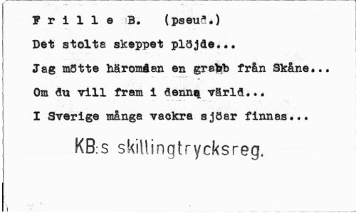 //// ! r i 1 1 e 3. (pseuft.) //// Det stolts skeppet plöjde... //// Jag mötte häromdan en grsfcb från Skåne... //// Om du vill fram i denn^ värld... //// I Sverige många vackra sjöar finnas... //// KB.s skillinqtrycksreg. //// i ////