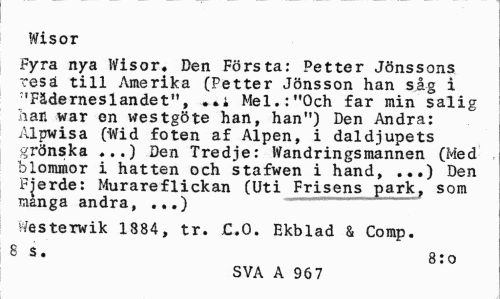 //// Wisor //// Fyra nya Wisor, Den Första: Petter Jönssons resa till Amerika (Petter Jönsson han såg i "Fäderneslandet", Mel.:"Och far min salig lian war en westgöte han, han") Den Andra: Alpwisa (Wid foten af Alpen, i daldjupets grönska ...) Den Tredje: Wandringsmannen (Med blommor i hatten och stafwen i hand, ...) Den F^erde: Murareflickan (Uti Frisens park, som manga andra, .,.) //// Westerwik 1884, tr. C.0. Ekblad & Comp. //// 8 s» 8:o //// SVA A 96 7 ////