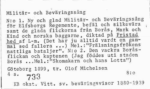 //// Militär- och Beväringssång //// N:o 1. Ny och glad Militär- och Beväringssång för Elfsborgs Regemente, befäl och silkevära ( samt de glada flickorna från Borås, Mark och I Kind och norska baggarne, diktad på Fristad hed af L-m. (Det har ju alltid vardt en gammal sed fallera ...) Mel.:"Frälsningsfrökens nattliga bataljer". N:o 2. Den vackra Boråsflickan och kaptenen (Jag föddes uti staden Borås ...Mel"Skomakarn och hans Lotta") //// Göteborg 1899, tr. Olof Michelsen 4 s. 8: o //// KB okat, Vitt, sv. beväringsvisor 1880-1939 ////