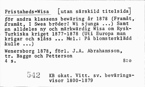 //// Fristaheds=Wisa [utan särskild titelsida] //// för andra klassens bewäring år 1878 (Framåt, iframåt, I Swea broderi Wi sjunga ...) Samt en alldeles ny och märkwärdig Wisa om Rysk-Turkiska kriget 1877-1878 (Uti Europa man krigar och slåss ... Mel.: På blomsterklädd kulle ...) //// Wenersborg 1878, förl. J.A. Abrahamsson, tr. Bagge och Petterson //// 4 s. 8:o //// 542 KB okat. Vitt. sv. bevärings-visor 1800-1879 ////
